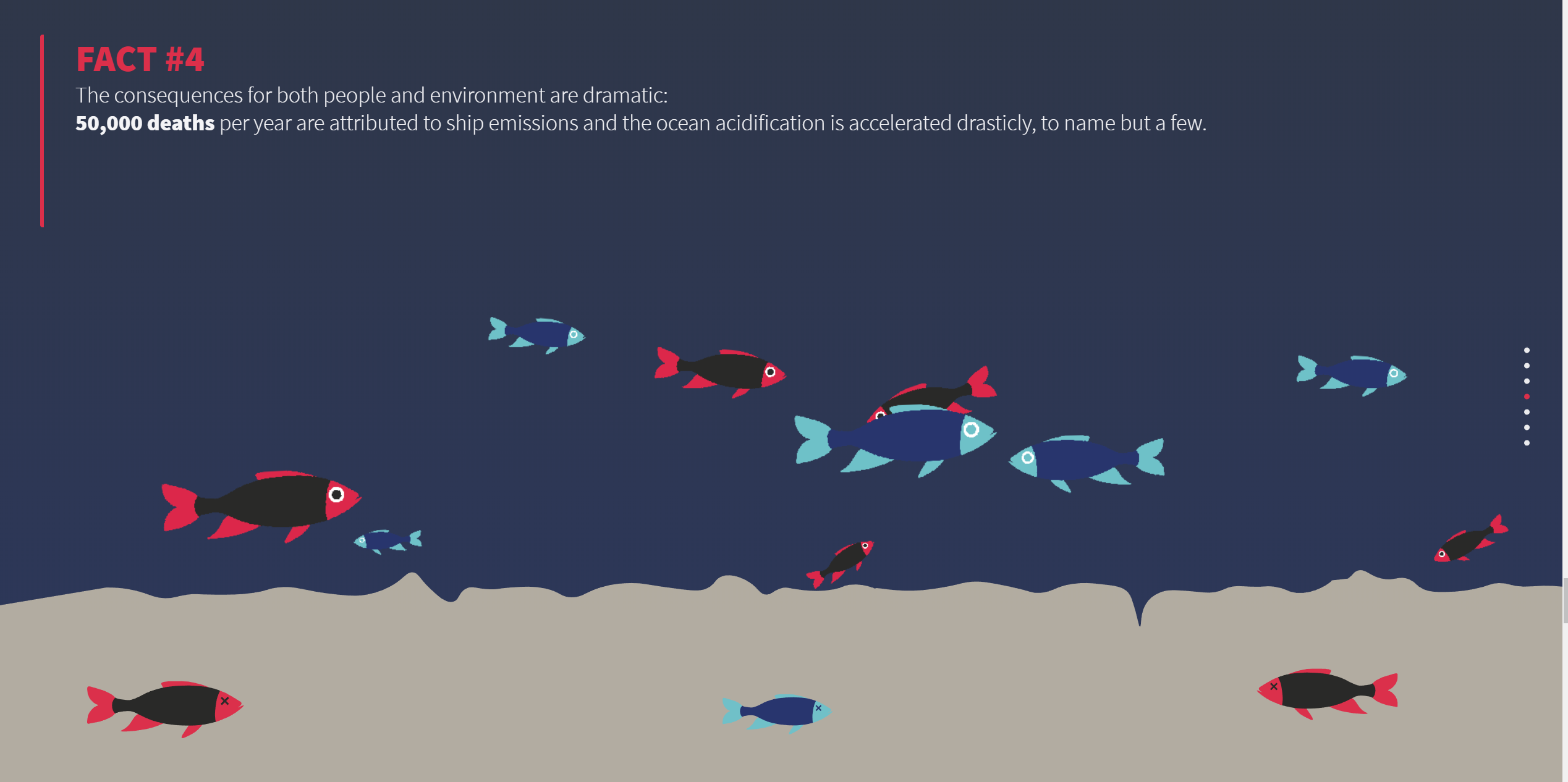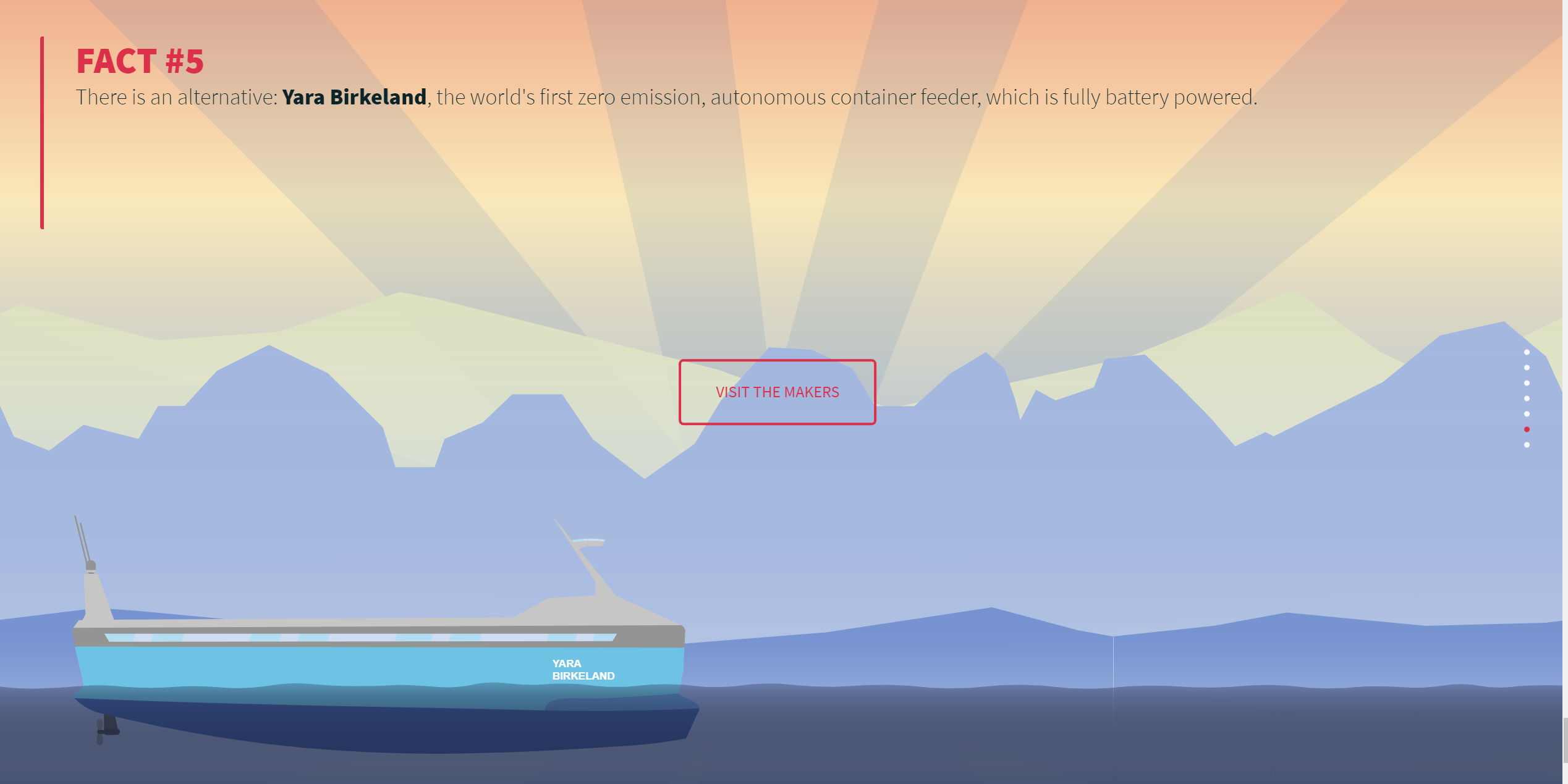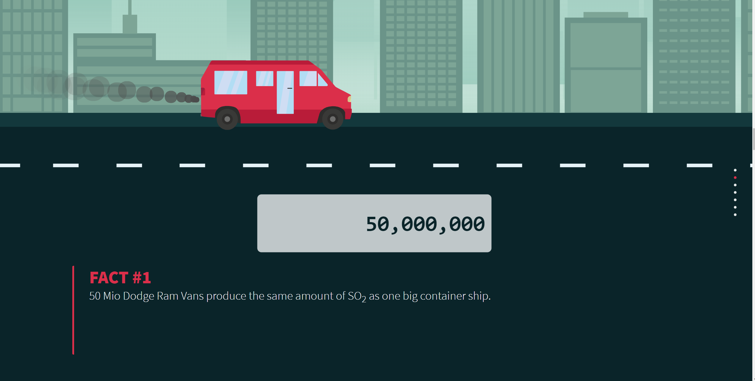 The idea we finally realized was a storytelling interface where we could visualize our research. We wanted to show the audience how bad pollution of container ships is compared to daily used things like cars. For that we created a website where we can illustrate facts. In summary we seperated our story in five facts. With every fact we tell something about container ship pollution or compare things against eachother. A visitor can read our story by scrolling through those facts.